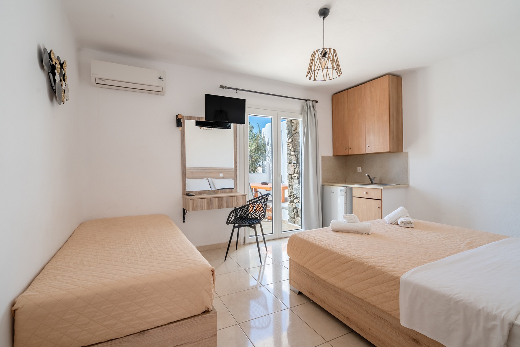 The Standard Family Studio at Katerina View is an exceptionally large open-plan accommodation (approx. 45 m²), specifically designed to host families or groups of up to 5 guests.